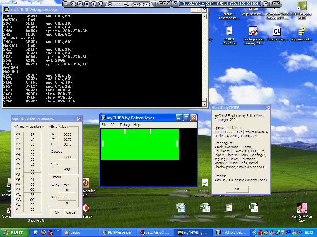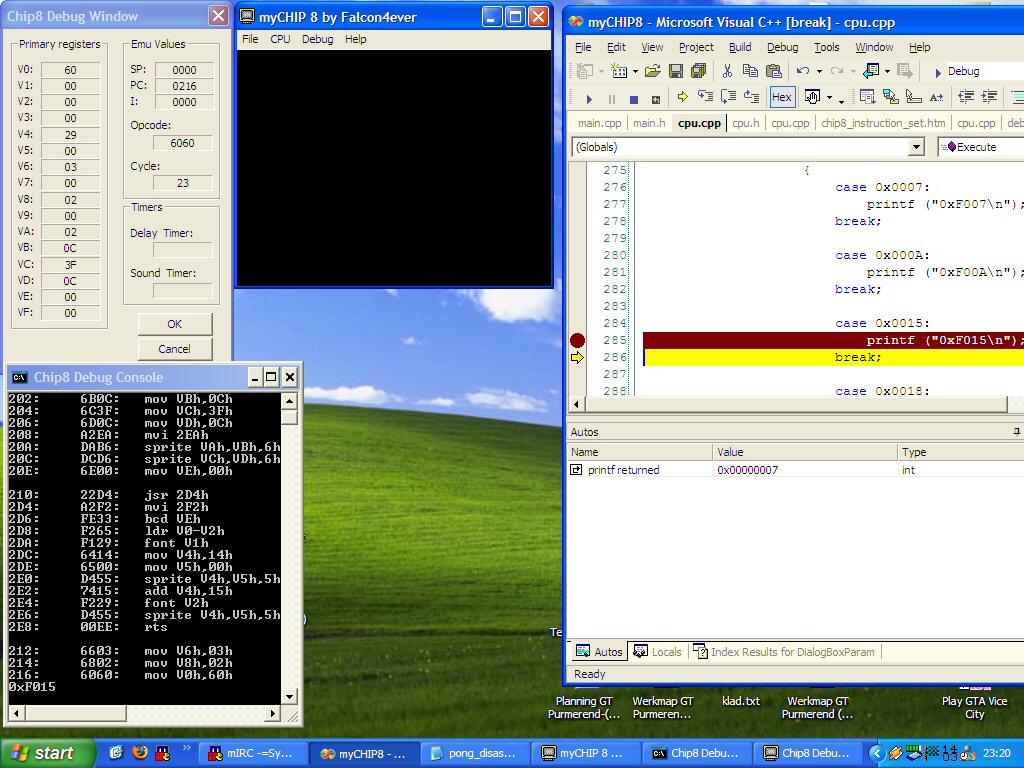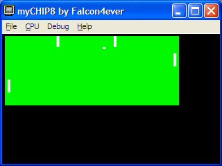 At that time I was searching for a simple system to emulate (which wouldn’t take me years). A friend of mine recommended to try writing a Chip8 interpreter. More information of the design of the Chip8 (virtual) cpu can be found on Wikipedia. The screenshots below show my own Chip8 implementation running on Windows.